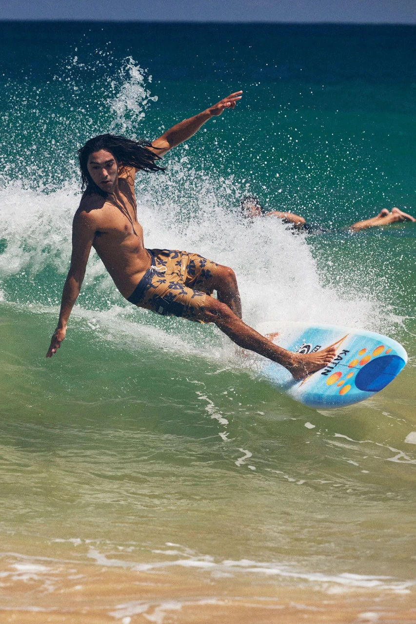 Katin custom Kehei Trunks, made with 55% cotton, 39% nylon, and 6% spandex. Featuring our classic snap fly closure design, boat rope drawstring closure, and a 17″ outseam.