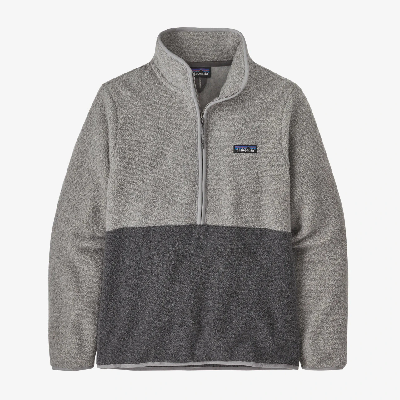 Weather-resistant recycled nylon trim with a DWR (durable water repellent) finish on front zipper and collar